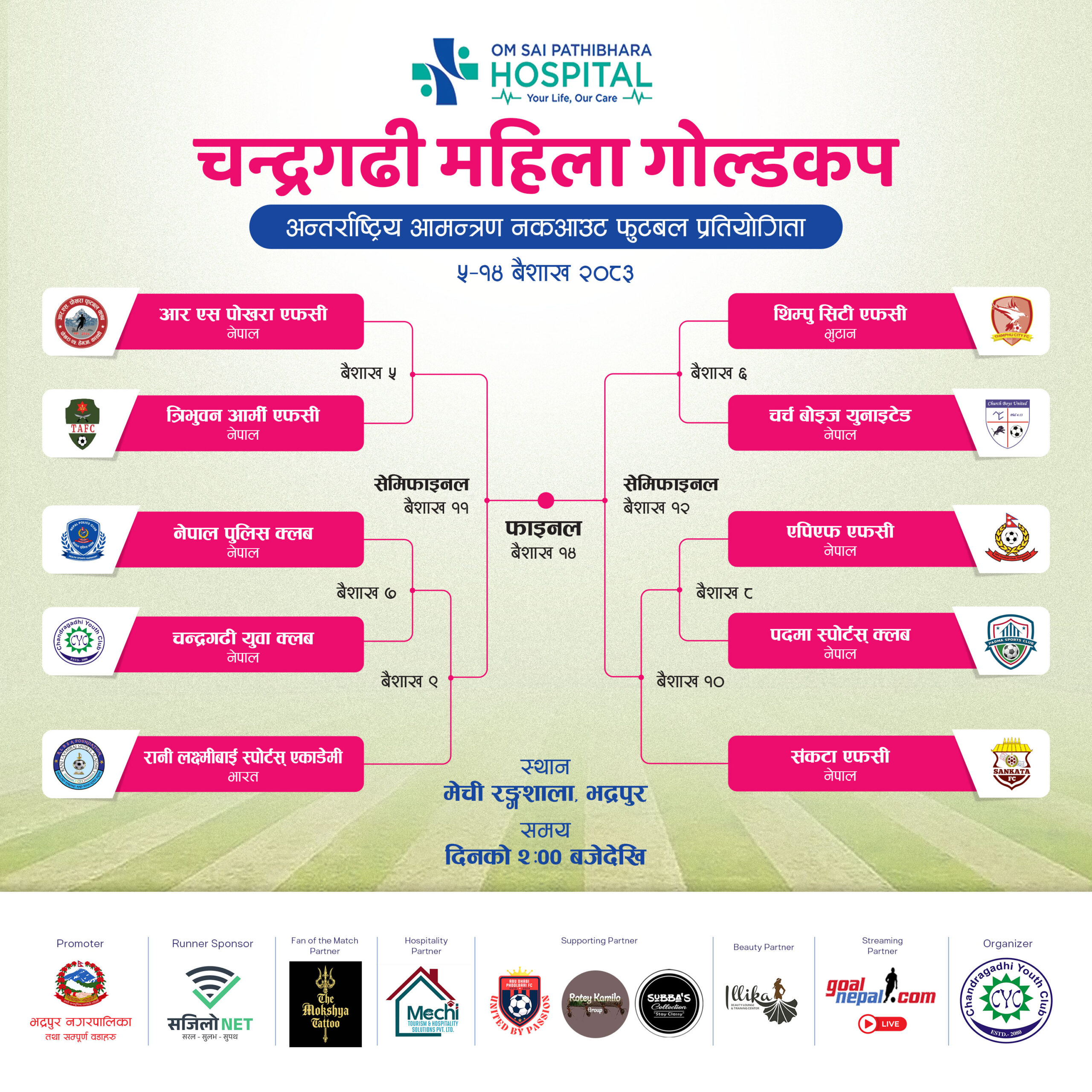 भद्रपुरको मेची रंगशालामा सञ्चालन हुने प्रतियोगिताको मुख्य प्रयोजक भद्रपुरकै ओम साई पाथिभरा हस्पिटल रहेको छ ।