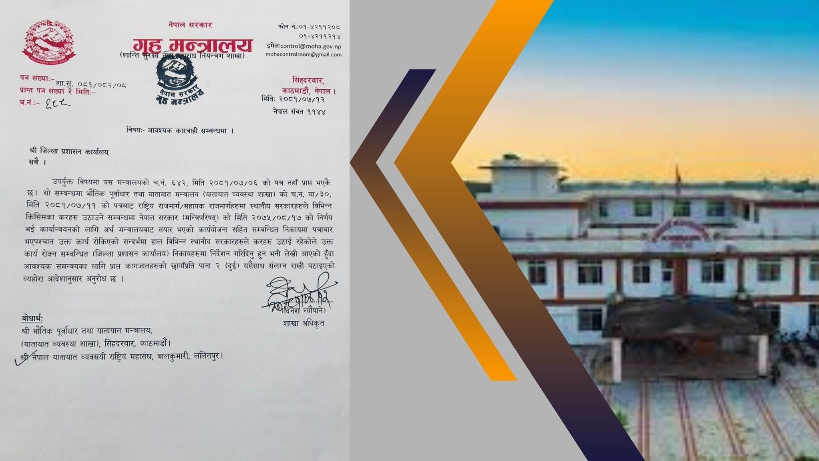 गत वर्ष २०८१ कात्तिक १२ गते गृह मन्त्रालयले देशभरका ७७ वटै जिल्ला प्रशासन कार्यालयलाई पत्राचार गर्दै स्थानीय तहले सडक तथा राजमार्गमा विभिन्न शीर्षकमा उठाइरहेको कर तत्काल रोक्न निर्देशन दिएको थियो । उक्त निर्देशनको उद्देश्य एउटै थियो–राजमार्गजस्तो राष्ट्रिय सम्पत्तिमा अनावश्यक करको बोझ हटाउने र व्यवसायीलाई सहज वातावरण उपलब्ध गराउने ।