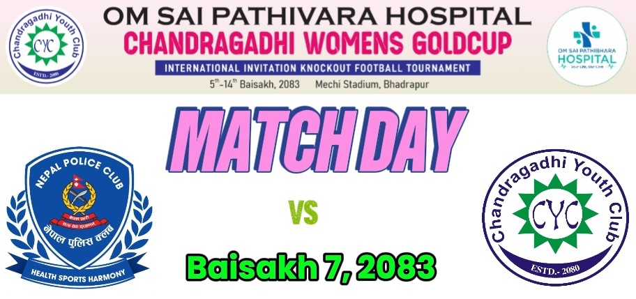 ओम साई पाथिभरा हस्पिटल चन्द्रगढी महिला गोल्डकप अन्तर्राष्ट्रिय आमन्त्रण नकआउट फुटबल प्रतियोगिता आज (सोमबार) विभागीय टोली नेपाल पुलिस क्बल र आयोजक चन्द्रगढी युथ क्लब प्रतिस्पर्धा गर्दैछन् ।