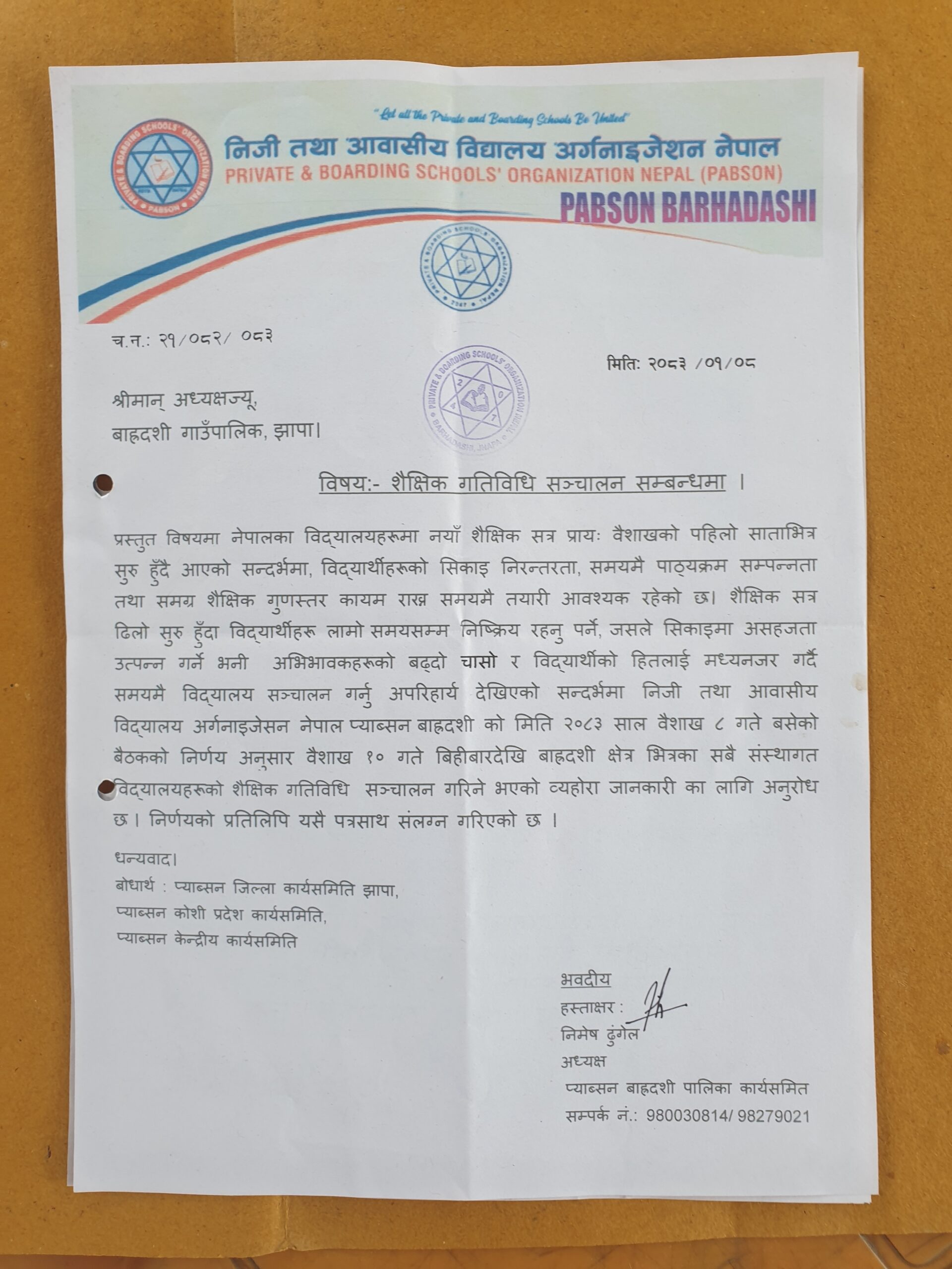 प्याब्सनका प्रतिनिधिहरू बाह्रदशी अध्यक्ष निमेश ढुङ्गेल, झापा सचिव लक्ष्मीप्रसाद उप्रेती, एन–प्याब्सन कोशी प्रदेशका उपाध्यक्ष रामकुमार सिंह राजवंशीसहितको टोलीले गाउँपालिकाका कार्यवाहक अध्यक्ष शान्तादेवी शिवाकोटी खरेल, निमित्त प्रमुख प्रशासकीय अधिकृत नारायण खरेल तथा शिक्षा शाखा प्रमुख गीता सुवेदीलाई उक्त पत्र हस्तान्तरण गरेको हो ।