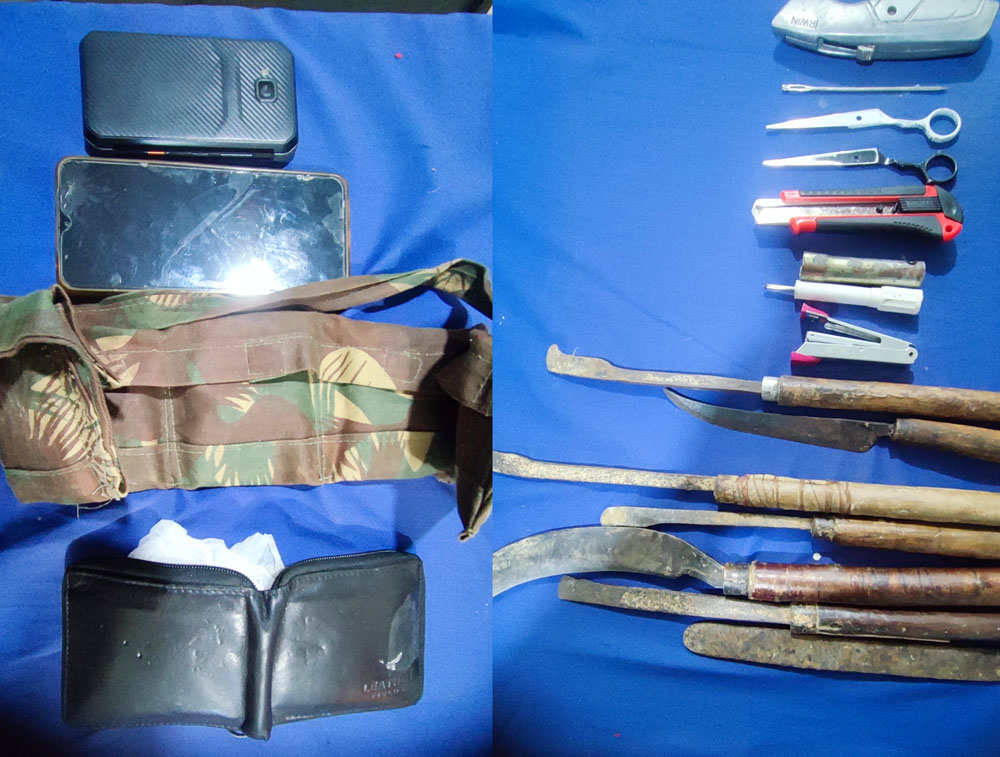 प्रहरीले उनको साथबाट प्रहरीको निलो रुकस्याक झोला एक थान, एसएलआर राइफलको राउण्ड २५ थान, चार्चर ब्रिज पाँच थान, बिन्दुलि एक थान, नगद १६ हजार सात सय २५, अलैँची टिप्न प्रयोग हुने घरेलु हतियार सिकल चार थान, हँसिया एक थान, रेड्मि मोबाइल एक थान, भारतीय सिमकार्ड एक थान र ब्याट्री नभएको कालो मोबाइल एक थान बरामद गरेको छ ।