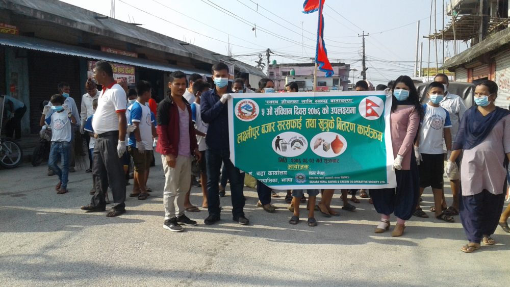 संविधान दिवसको अवसरमा सहारा नेपाल बचत तथा ऋण सहकारी संस्था लक्ष्मीपुर सेवा केन्द्र तथा कनकाई नगरपालिका वडा नं. ८ को संयुक्त आयोजनामा सरसफाई तथा खुत्रुके वितरण कार्यक्रम भएको छ ।