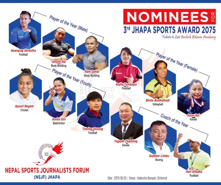 नेपाल खेलकुदर पत्रकार मञ्च झापाले तेस्रो झापा स्पोर्टस् अवार्डको मनोनयनमा पर्न सफल प्रतिभाको नाम सार्वजनिक गरेको छ ।