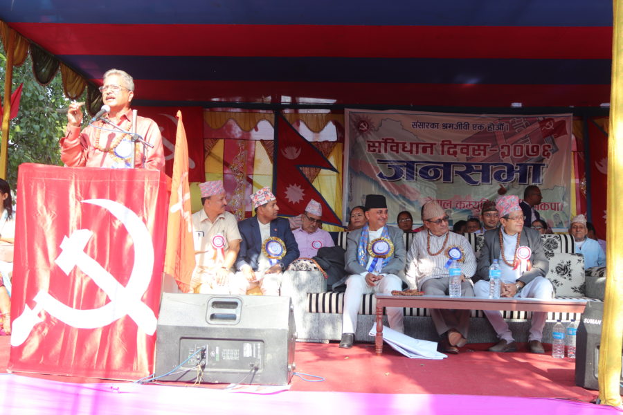 नेकपा झापा अध्यक्ष चिन्तन पाठकको अध्यक्षता र पार्टीका केन्द्रीय सदस्य एवम् झापा ईञ्चार्ज रवीन कोइरालाको स्वागत मन्तव्य रहेको कार्यक्रममा नेकपा १ नं. प्रदेश सदस्य जसमाया गजमेर, झापा सहईञ्चार्ज धर्मशिला चापागाई, पार्टीको अन्तर्राष्ट्रिय विभाग उपप्रमुख एवम् केन्द्रीय सदस्य राम कार्की (पार्थ), १ नं. प्रदेश अध्यक्ष देवराज घिमिरे, १ नं. प्रदेश ईञ्चार्ज भीम आचार्य, स्थायी समिति सदस्य हरिबोल गजुरेल (शीतलकुमार) लगायतले नेपालको संविधान २०७२ जनपक्षीय संविधान रहेको र यसको रक्षा तथा विकास गर्नुपर्ने बताए । कार्यक्रममा चर्चित हास्यकलाकार राजा राजेन्द्र, गीतकार हरि पौडेल लगायतले आफ्ना प्रस्तुति राखेका थिए ।