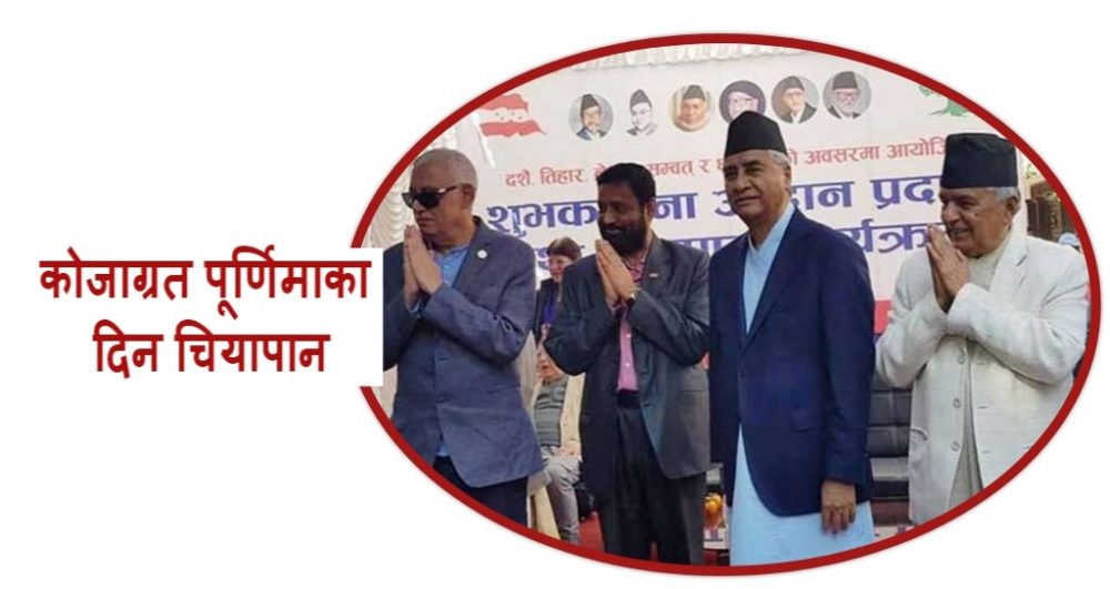 नेपाली काङ्ग्रेसले आइतबार कोजाग्रत पूर्णिमाका दिन चियापान समारोह तथा शुभकामना आदानप्रदान कार्यक्रम गर्ने भएको छ । विसं २०३३ मा जननेता बिपी कोइराला राष्ट्रिय एकता तथा मेलमिलापको नीति लिई स्वदेश फर्केपछि २०३४ सालदेखि प्रत्येक वर्ष काङ्ग्रेसले कोजाग्रत पूर्णिमाको दिनमा चियापान समारोह गर्दै आएको छ ।