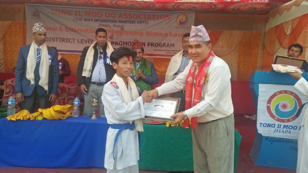 तङ इल मो–दो संघ नेपाल जिल्ला कार्यसमिति झापाले अन्तर्राष्ट्रिय तथा राष्ट्रिय खेलाडीलाई सम्मानसहित बेल्ड प्रदान गरेको छ ।
