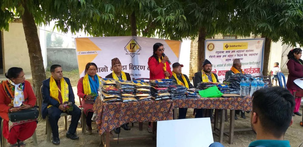 रोटरी क्लब अफ भद्रपुरले हल्दिवारी गाउँपालिका–३स्थित रामेश्वर प्राथमिक विद्यालयका छात्रछात्रालाई न्यानो कपडा वितरण गरेको छ ।