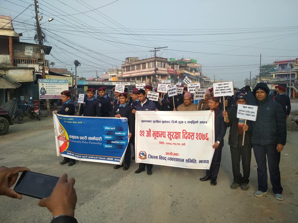 प्रदेशसभा सदस्य, कार्यालयका प्रमुख, कर्मचारी, भद्रपुर नगरपालिका प्रमुख, उपप्रमुखलगायत सहभागी प्रभातफेरीमा ‘घटाऔँ भूकम्पको खतरा जागरुक भई’, ‘आउला भूकम्प भत्काउला घर’, ‘जिउधन जोगाउने हाम्रो कर’, ‘सस्तो सुलभ वैज्ञानिक प्रविधिको विकास गरौँ’लगायतका नारा लेखिएको प्लेकार्ड बोकिएको थियो ।
