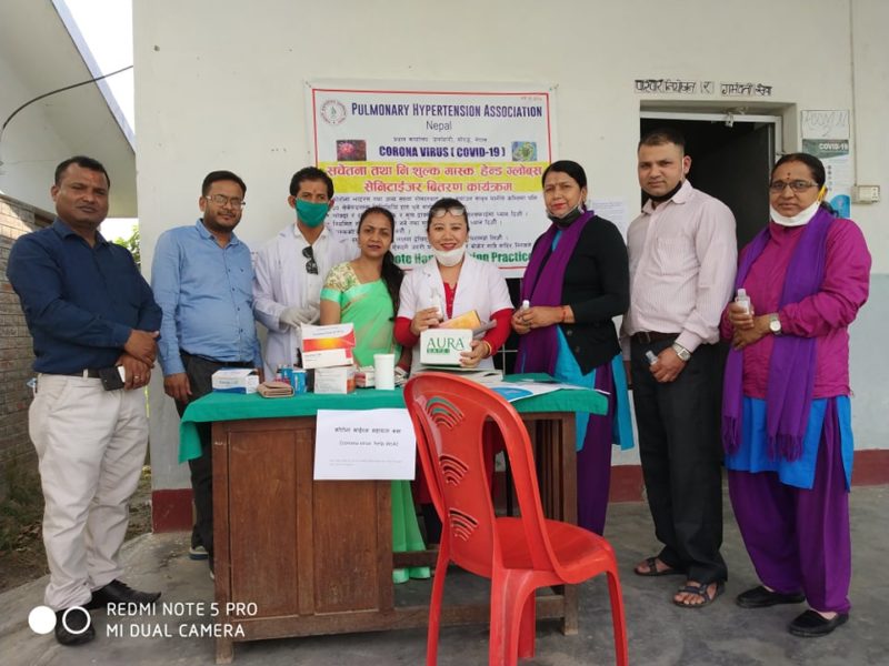 सामाजिक संस्था पुल्मोनरी हाइपरटेन्सन एसोएिएसन नेपाल(पिएचए नेपाल)ले झापाका विभिन्न स्थानमा कोरोना भाइरस कोभिड– १९ बाट बच्न सचेतना सहित सेनिटाइजर, हेण्डग्लोव्स, हेण्ड वास,मास्क वितरण गरेको छ ।