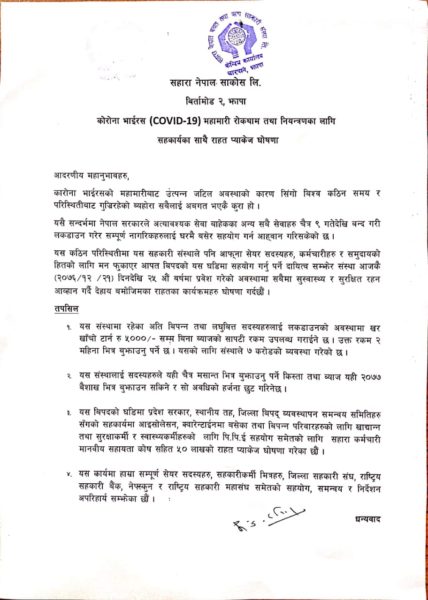 सहकारीले संस्थाका सदस्यहरुलाई चैत मसान्त भित्र वुझाउनु पर्ने किस्ता तथा व्याज २०७७ साल बैशाख महिना भित्र बुझाउन सकिने र सो अवधिको हर्जना समेत छुट गरिने जनाएको छ ।