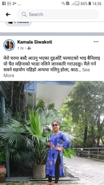 उनले आफ्नो फसवुक पेजमा लेखेकिछन् ‘म मेरो घरमा बस्दै आउनु भएका दुईओटै फल्याटको भाइ बहिनीलाई यो चैत महिनाको भाडा नलिने जानकारी गराउदछु । मैले गर्न सक्ने सहयोग यहि हो यसलाई अन्यथा नलिनु होला । काठमाण्डौको घरकको मात्र नभएर काँकरभिट्टाको घरको पनि हो भन्ने जानकारी यहि फेसवुक मार्फत जनाएको छु धन्यवाद ।’