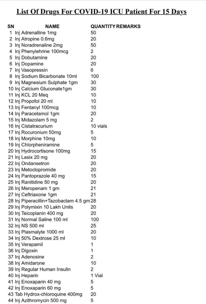 स्वास्थ्य तथा जनसंख्या मन्त्रालयले कोरोना संक्रमितको उपचार गर्न ४४ प्रकारका औषधीको सूची तयार गरेको छ। कम्तिमा १५ दिन इन्टेन्सिभ केयर युनिट (आइसीयू) मा राख्नुपर्दा कोरोना संक्रमितले यी ४४ थरीका अत्यावश्यक औषधी सेवन गर्नुपर्नेछ।