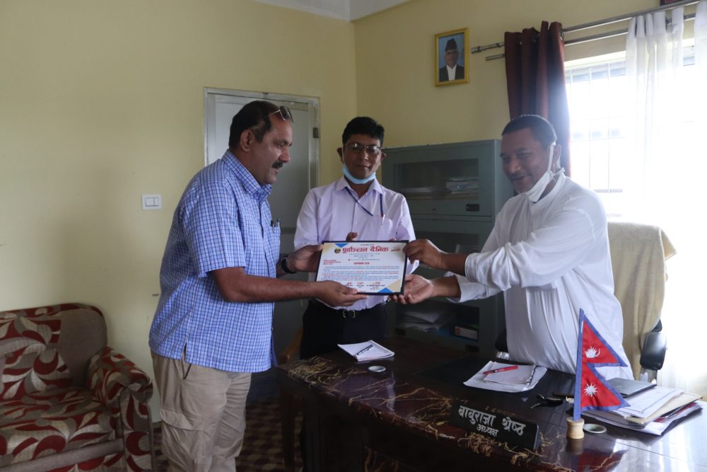 गौरीगञ्ज गाउँपालिका अध्यक्ष बावुराजा श्रेष्ठलाई सम्मान पत्र प्रदान गर्दै पूर्वाञ्चल दैनिकका प्रकाशन सहयोगी भानु शिवाकोटी । पूर्बाञ्चल दैनिकले रजत वर्षको अवसरमा गाउँपालिकालाई सम्मान गरेको हो । साथमा गाउँपालिकाका उपाध्यक्ष दीपिन्द्र थापा ।