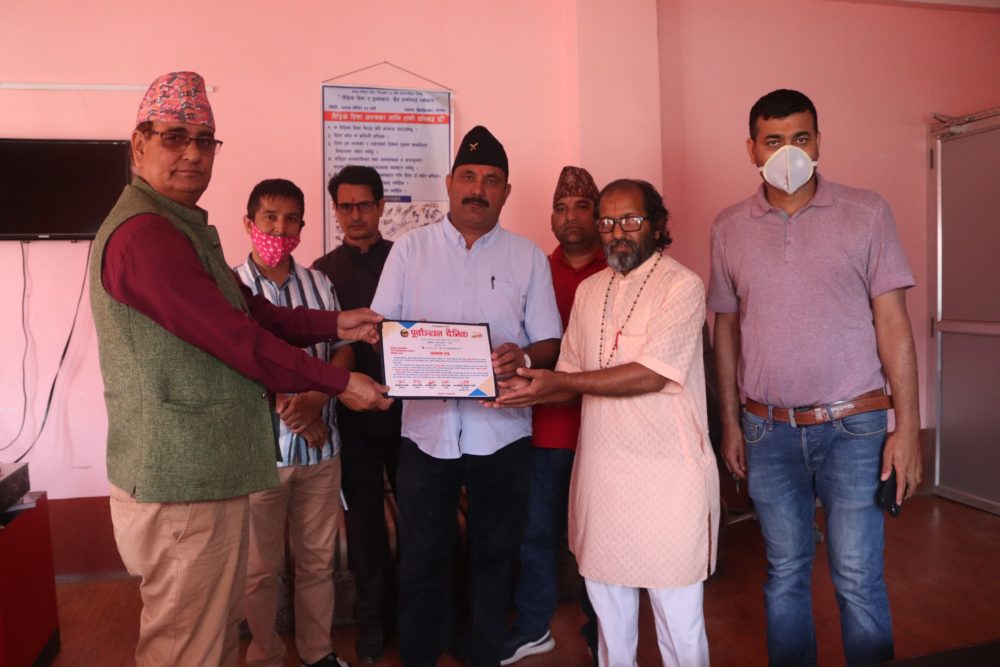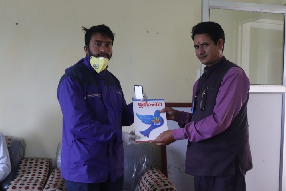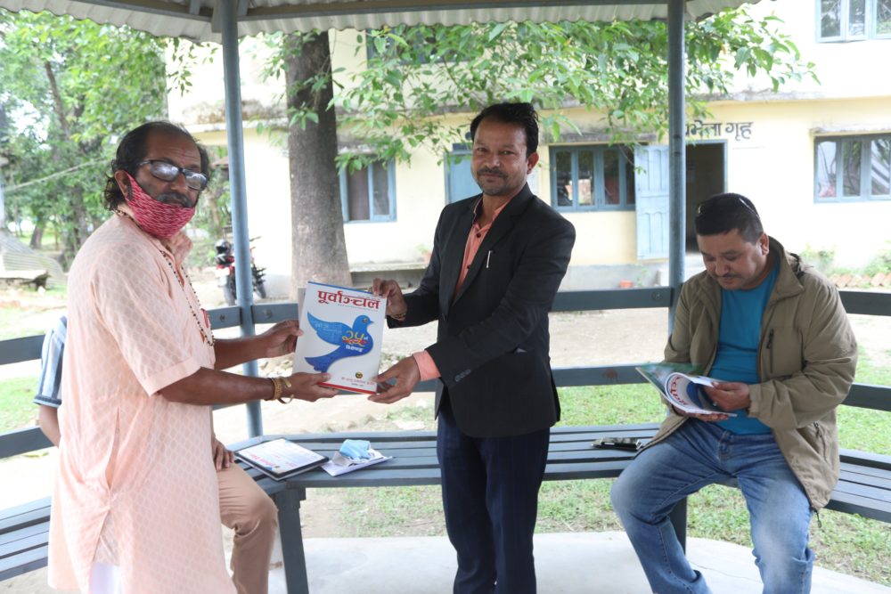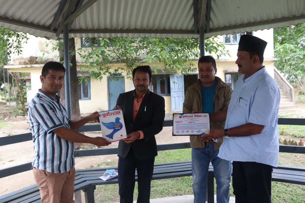 कचनकवल गाउँपालिका प्रमुख अञ्जार आलमलाई पूर्वाञ्चल दैनिकको विशेषाङ्क प्रदान गर्दै पूर्वाञ्चल दैनिकका व्यवस्थापक चन्द्रकान्त ढकाल । साथमा जिल्ला प्रहरी कार्यालय झापाका प्रहरी नायव उपरीक्षक महेन्द्रकुमार श्रेष्ठ