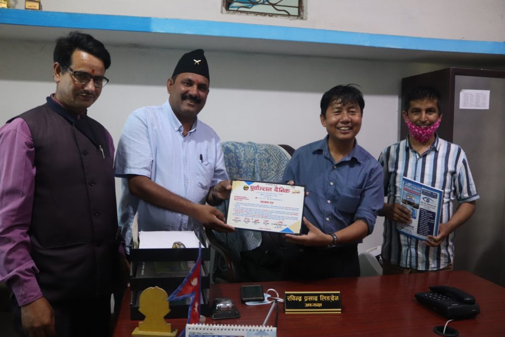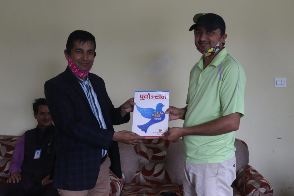 बिर्तामोड नगरपालिका प्रमुख ध्रुवकुमार शिवाकोटीलाई सम्मान पत्र प्रदान गर्दै पूर्वाञ्चल दैनिकका प्रकाशन सहयोगी भानु शिवाकोटी । पूर्बाञ्चल दैनिकले रजत वर्षको अवसरमा नगरपालिकालाई  सम्मान गरेको हो ।