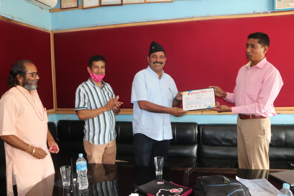 हल्दिवारी गाउँपालिका प्रमुख रबिन्द्र लिङ्देनलाई सम्मान पत्र प्रदान गर्दै पूर्वाञ्चल दैनिकका प्रकाशन सहयोगी भानु शिवाकोटी । पूर्बाञ्चल दैनिकले रजत वर्षको अवसरमा गाउँपालिकालाई सम्मान गरेको हो ।