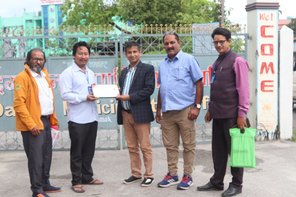 भद्रपुर नगरपालिका प्रमुख जीवन कुमार श्रेष्ठलाई सम्मान पत्र प्रदान गर्दै पूर्वाञ्चल दैनिकका प्रकाशन सहयोगी भानु शिवाकोटी । पूर्बाञ्चल दैनिकले रजत वर्षको अवसरमा नगरपालिकालाई सम्मान गरेको हो ।