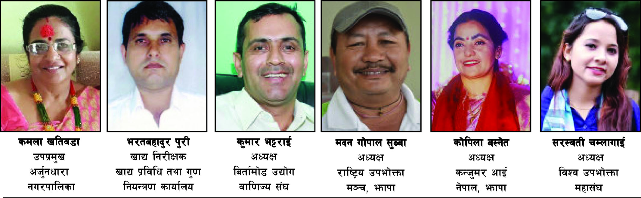 अर्जुनधारा नगरपालिकाकी उपप्रमुख कमला खतिवडा आचार्य, खाद्य परीक्षण तथा गुण नियन्त्रण कार्यालय झापाका खाद्य निरीक्षक भरतबहादुर पुरी, बिर्तामोड उद्योग वाणिज्य संघका अध्यक्ष कुमार भट्टराई, राष्ट्रिय उपभोक्ता मञ्चका जिल्ला अध्यक्ष मदन गोपाल सुब्बा, कन्जुमर आई नेपालकी जिल्ला अध्यक्ष अधिवक्ता कोपिला खड्का बस्नेत, विश्व उपभोक्ता महासंघकी अध्यक्ष सरस्वती चौलागाँईबीच भएको संवादमा पाँच बुँदे निष्कर्षसहित सरोकारवालालाई सुझाव दिइएको छ ।