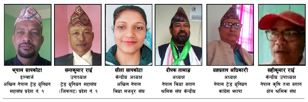 अखिल नेपाल ट्रेड युनियन महासंघ प्रदेश नं. १ इञ्चार्ज भूपाल सापकोटा, ट्रेड युनियन महासंघ(जिफण्ट) प्रदेश नं. १ उपाध्यक्ष सन्तकुमार राई, अखिल नेपाल चिया मजदुर संघ केन्द्रीय अध्यक्ष सीता सापकोटा सन्ध्या, नेपाल चिया बगान श्रमिक संघ केन्द्रीय अध्यक्ष दीपक तामाङ, नेपाल ट्रेड युनियन कांग्रेस झापा अध्यक्ष यज्ञप्रताप अधिकारी, नेपाल कृषि तथा बगान क्षेत्र श्रमिक संघ केन्द्रीय उपाध्यक्ष सहीकुमार राईले चिया श्रमिकका समस्या ततकाल समाधान नगरे अवस्था जटिल बन्ने बताए ।