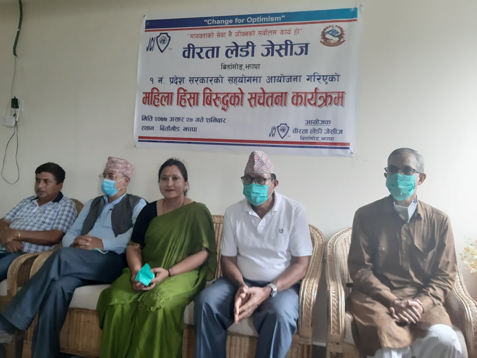 वीरता लेडी जेसीजको आयोजनामा महिला हिंसाविरुद्धको सचेतना कार्यक्रम सम्पन्न भएको छ । लकडाउनको समयमा महिला हिंसा वढीरहेको भन्दै त्यसलाई न्युनीकरण गर्ने उद्धेश्यले प्रदेश नंं. १ सरकारको सहयोगमा महिला हिंसाविरुद्धको सचेतना कार्यक्रम गरिएको हो ।