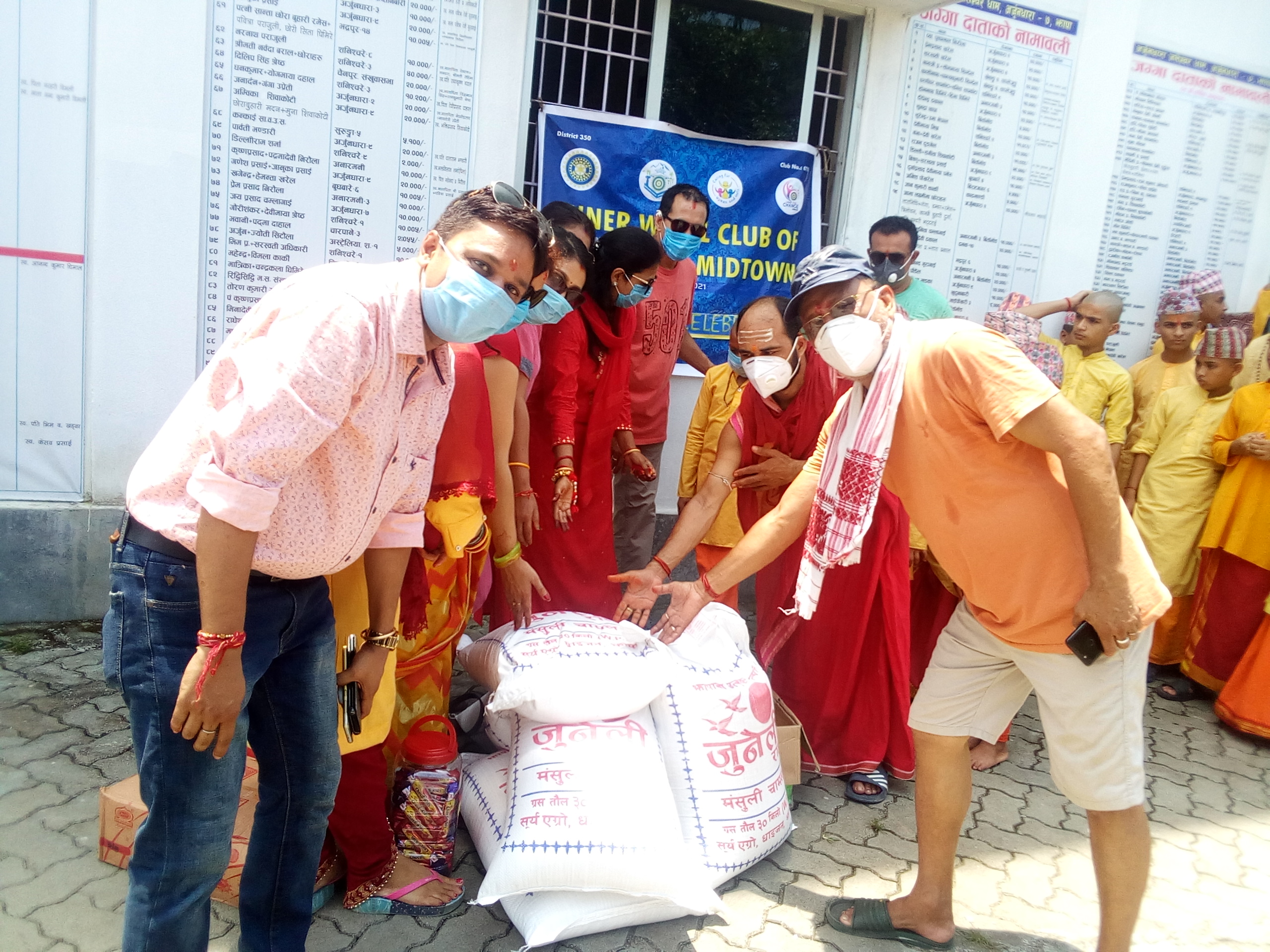 इनरह्वील क्लव अफ विर्तामोड मिडटाउनकी प्रेसिडेन्ट रेनु वंशल, चाटर्ड प्रेसिडेन्ट भूमिका पोखरेल, सेक्रेटरी सम्झना भण्डारी, मेम्वर कमला पौडेल, रोटरी क्लव अफ बिर्तामोड मिडटाउनका प्रेसिडेन्ट प्रशान्त भण्डारी, रोटरी क्लव अफ बिर्तामोड मिडटाउनका क्लव सर्भिस कोअर्डिनेटर सुजित वंशल, बोर्ड मेम्वर जगत शर्मा, मिडिया पर्सन तुलसीप्रसाद निरौला लगायतले अर्जुनधारा जलेश्वरधामका मूल अर्चक अग्नि सिग्देल, अर्जुनधारा जलेश्वरधामका वरिष्ठ सदस्य चित्रशेन भण्डारीलाई खाद्यान्न हस्तान्तरण गरेका थिए ।
