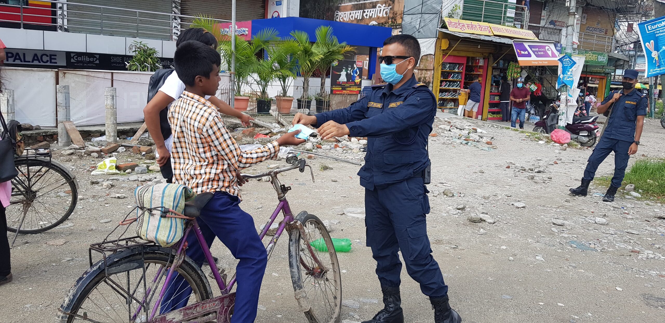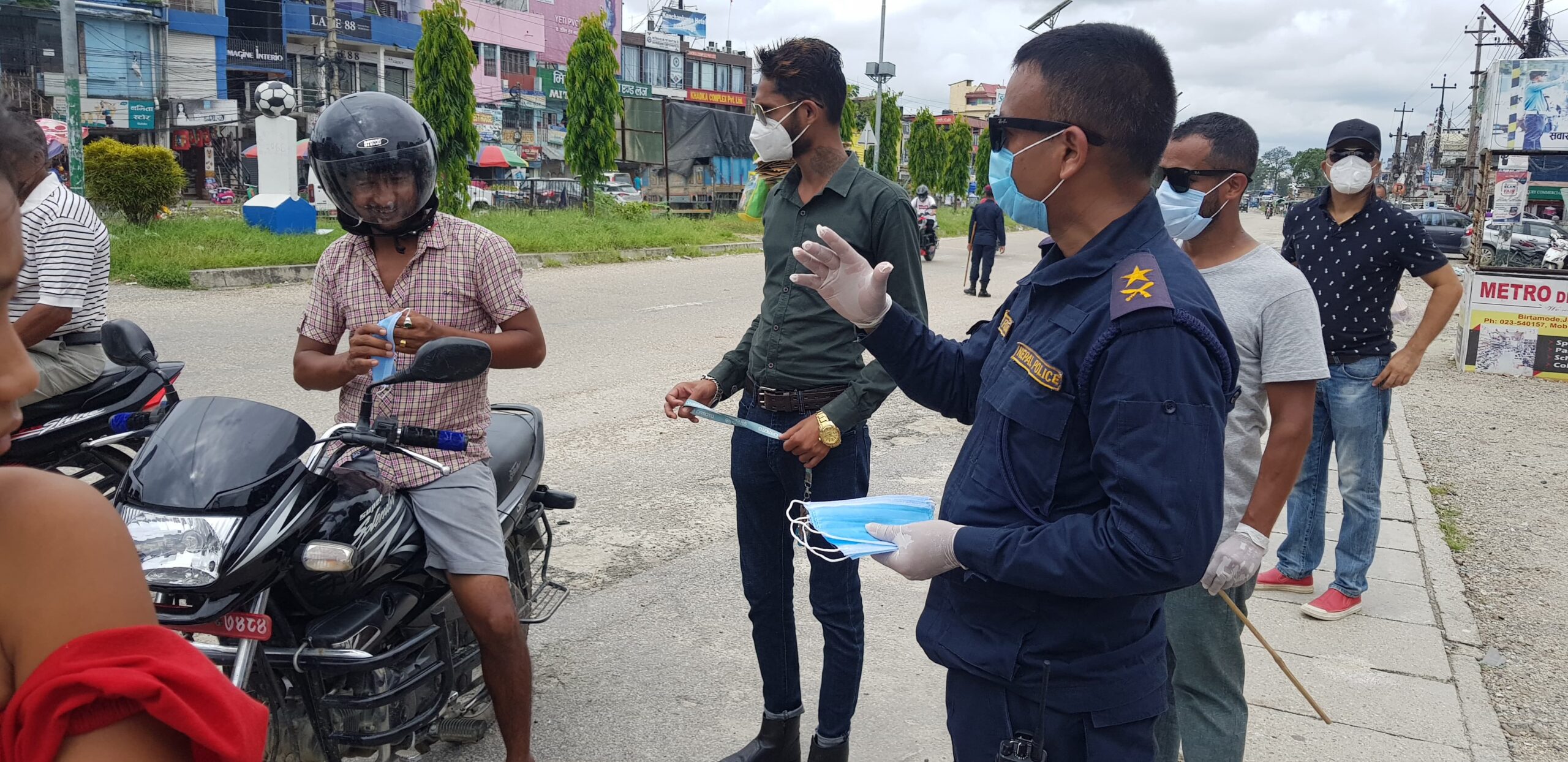 यसैबीच मास्क नलगाई हिँड्नेलाई संक्रामक रोग ऐनको व्यवस्था अनुसार जनही १०० रुपैयाँ जरिवाना गर्ने गृहमन्त्रालयले चेतावनी दिएर कारबाही समेत अघि बढाएको थियो । प्रशासनको तर्फबाट अनुगमनमा गएको टोलीले मास्क लगाउन नजान्नेलाई लगाउने तरिका समेत सिकाएको थियो । इलाका प्रहरी कार्यालय बिर्तामोडका प्रहरी प्रमुख प्रहरी नायब उपरीक्षक मुकुन्द रिजालले जोखिमबाट बच्न नागरिकलाई पटक–पटक आग्रह गर्दै मास्क समेत वितरण गरेका थिए ।