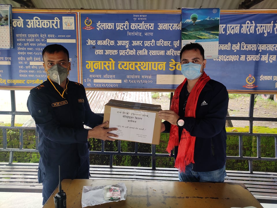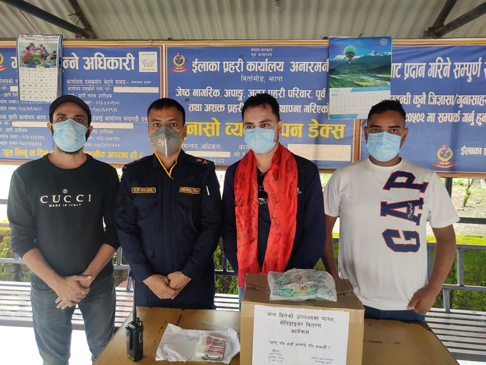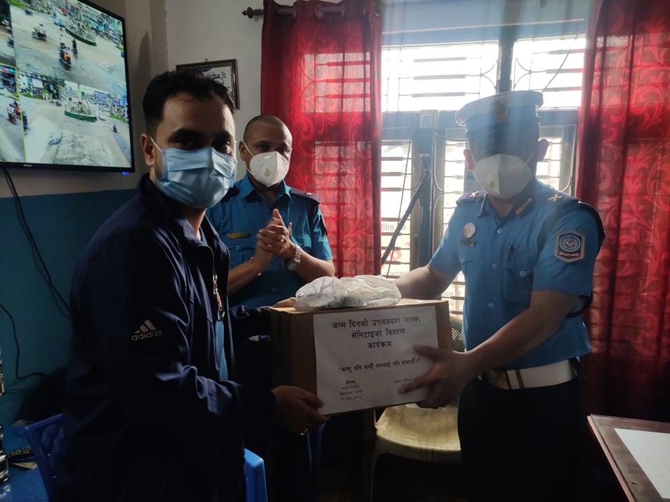 कोरोना भाइरसका कारण विश्वमा स्वास्थ्य संकट सिर्जना भइरहेको तथा नेपालमा समेत कोरोनाको संक्रमण बढ्दै गएसंगै जनताको सुरक्षामा अग्रस्थानमा खटिने धेरै प्रहरी समेत संक्रमित बन्दै गएका छन् । तर, देशको शान्ति सुरक्षामा खटिने प्रहरीले आफ्नो जिम्मेवारीलाई अविचलित रुपमा निर्वाह गरिरहेको र यो अवस्थामा अन्यत्र फजुल खर्च गर्नुभन्दा नागरिक स्तरबाट भएपनि सानो सहयोग गरौं भन्ने उद्धेश्यले झापाका एक युवाले आफ्नो जन्मदिनमा प्रहरीलाई मास्क र सिनिजाइजर प्रदान गरेर मनाएका छन् ।