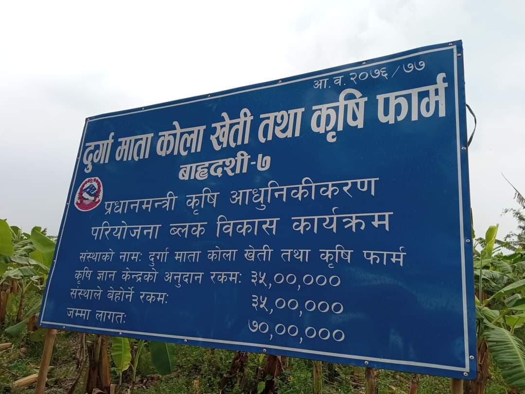 कृषि ज्ञान केन्द्रमार्फत नै अनुदानको रकम पाउने अर्काे संस्था हो– बाह्रदशी गाउँपालिका–७ मा रहेको दुर्गा माता कोला खेती तथा कृषि फर्म । जसले प्रधानमन्त्री कृषि आधुनिकीकरण परियोजना ब्लक बिकास कार्यक्रमका लागि ३५ लाख रुपैयाँ अनुदान लिएको छ । संस्थाले ३५ लाख रुपैयाँ फर्मको लगानी रहने गरी सो रकम अनुदानमा लिएको हो ।