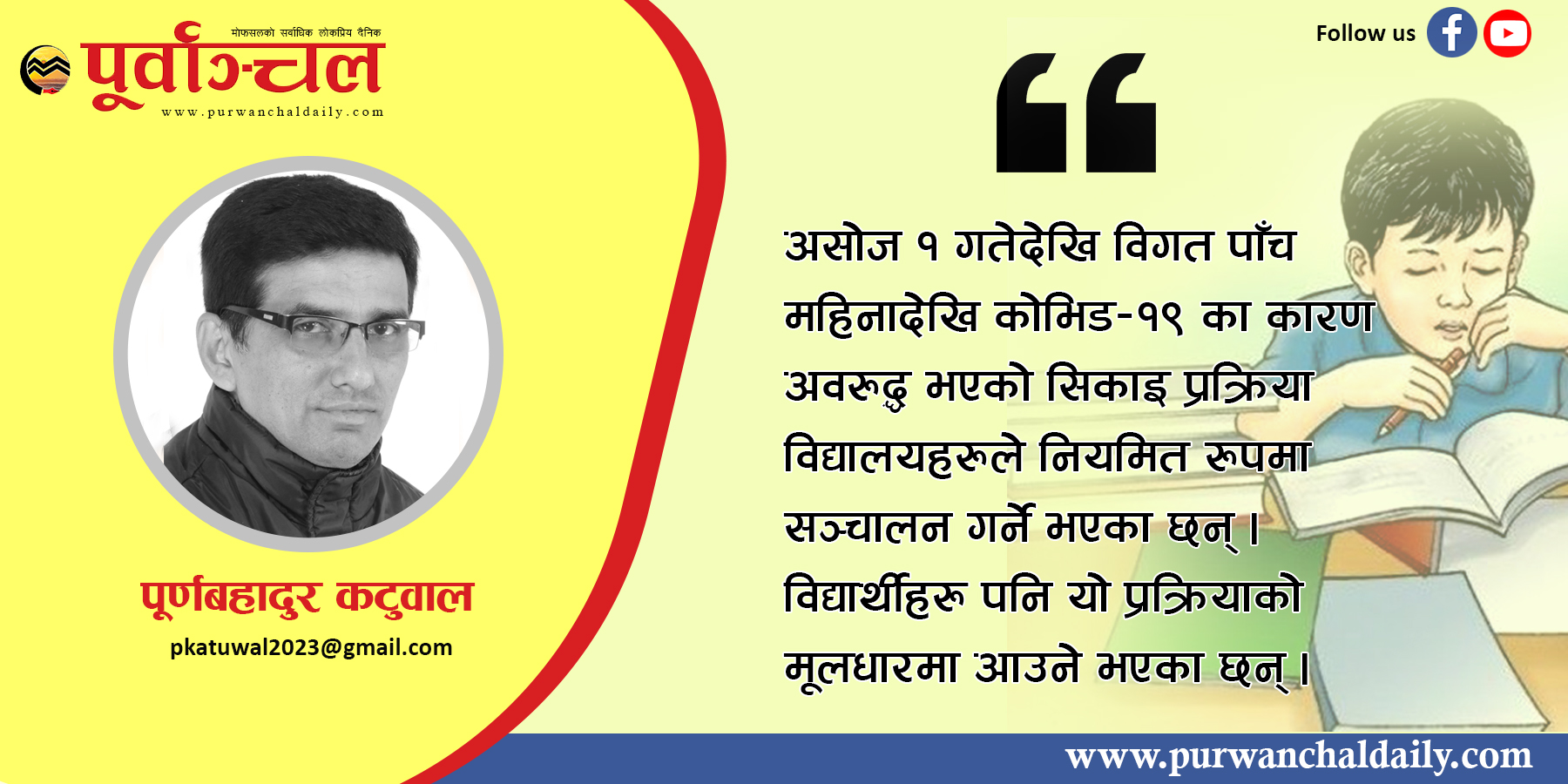 मय परिस्थिति, शिक्षणमा प्रविधिको पहँुचको आधारलाई हेर्ने हो भने अनलाइन पद्धति तुरन्तै प्रयोग गर्न नसकिए पनि अन्य विकल्पलाई विद्यार्थीसम्म पुर्याउनुको विकल्प नै छैन । यसका लािग विद्यालयले निर्देशिकालाई आत्मसात गर्दै आ–आफ्नो तरिकाले प्रत्यक्ष साक्षात्कार माध्यमबाट शिक्षण सिकाइलाई अघि बढाउनुपर्छ ।