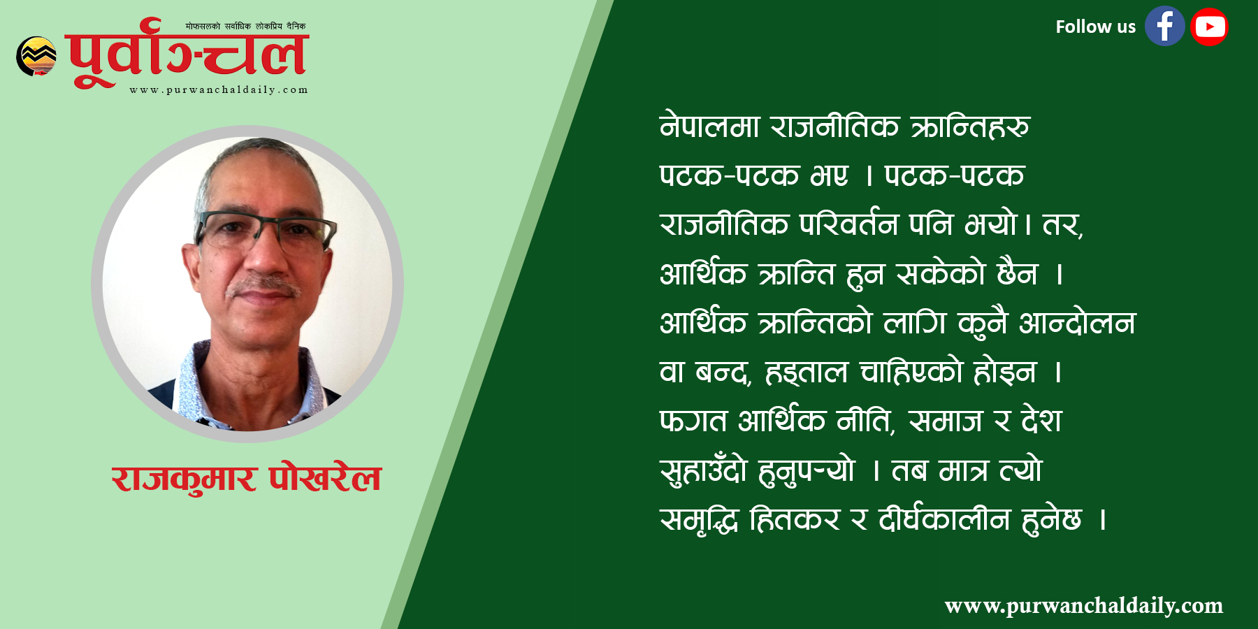 नेपालमा राजनीतिक क्रान्तिहरु पटक–पटक भए । पटक–पटक राजनीतिक परिवर्तन पनि भयो । तर, आर्थिक क्रान्ति हुन सकेको छैन । आर्थिक क्रान्तिको लागि कुनै आन्दोलन वा बन्द, हड्ताल चाहिएको होइन । फगत आर्थिक नीति, समाज र देश सुहाउँदो हुनुप¥यो । तब मात्र त्यो समृद्धि हितकर र दीर्घकालीन हुनेछ । कुनै पनि मानिसले पेशा व्यवसाय नगरी उसको जिविका चल्दैन । यदि त्यही पेशा व्यवसाय देश कै बढीभन्दा बढी कच्चापदार्थ प्रयोग हुने, रोजगारी बढी सृजना गर्नेखालको हामीले रोज्यौं भने सबैको हित गर्नेछ ।