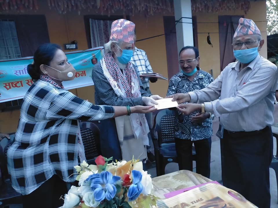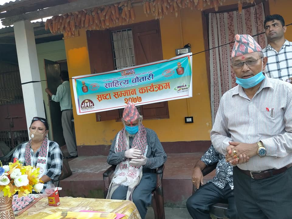 कोरोना भाइरसको संक्रमणबाट वच्न भौतिक दुरी कायम गरी झापा मेचीनगर –९ धुलावारीस्थित निवासमै गएर अग्रज साहित्यकार तेराखलाई सम्मान गरिएको उनले वताए ।