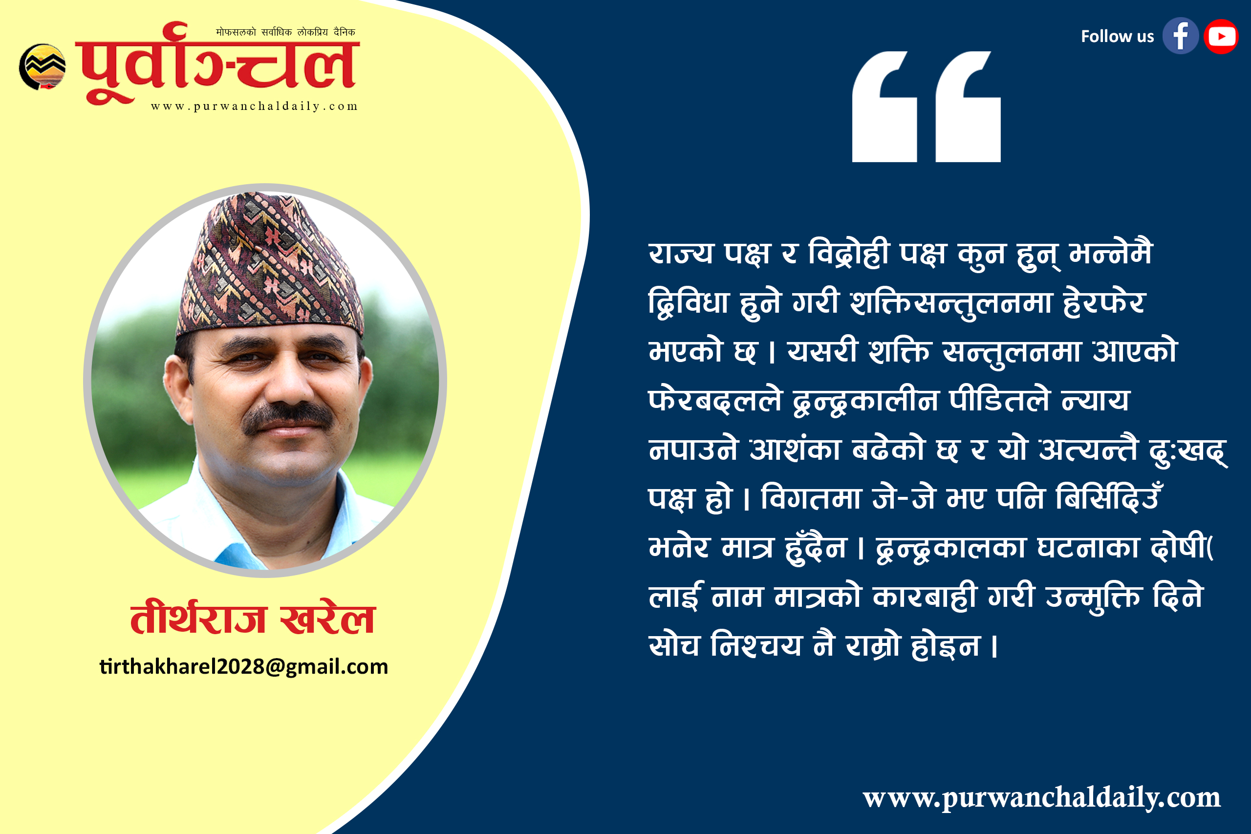 राज्य पक्ष र विद्रोही पक्ष कुन हुन् भन्नेमै द्विविधा हुने गरी शक्तिसन्तुलनमा हेरफेर भएको छ । यसरी शक्ति सन्तुलनमा आएको फेरबदलले द्वन्द्वकालीन पीडितले न्याय नपाउने आशंका बढेको छ र यो अत्यन्तै दुःखद् पक्ष हो । विगतमा जे–जे भए पनि बिर्सिदिउँ भनेर मात्र हुँदैन । द्वन्द्वकालका घटनाका दोषीलाई नाम मात्रको कारबाही गरी उन्मुक्ति दिने सोच निश्चय नै राम्रो होइन । यसबाट पीडितले न्याय नपाउने अवस्था आउँछ । नेपालको अन्तर्राष्ट्रिय छबि बिग्रन्छ । साथै उन्मुक्ति पाउने दोषीले भविष्यमा पनि दोषको सजाय भोग्नुपर्ने सम्भावना रहिरहन्छ र मानवताविरुद्धका जघन्य अपराध विश्वव्यापी क्षेत्राधिकार अन्तर्गत पर्ने भएकाले दोषीले अन्य देशबाट कारबाही हुने त्रासमा बस्नुपर्ने हुन्छ । तसर्थ हत्या, यातना, बलात्कार, बाल सैन्य लगायतका गम्भीर मानवअधिकार उल्लंघनका घटनामा प्रत्यक्ष संलग्न दोषीलाई कारवाही गर्न न्यूनतम् राजनीतिक सहमति हुन आवश्यक छ ।