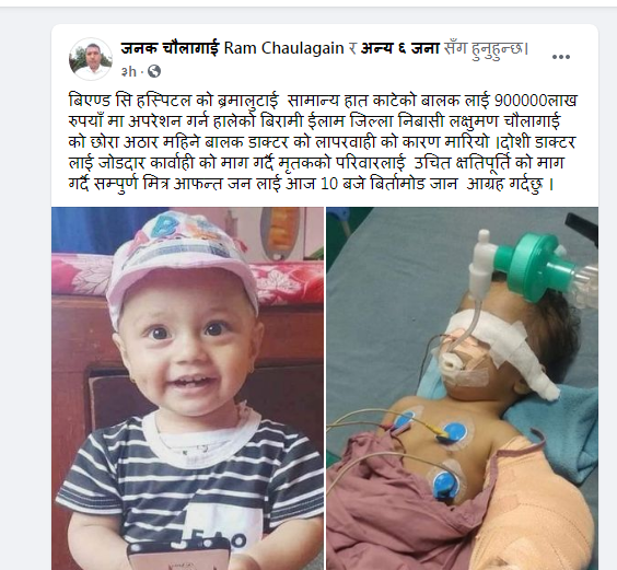 शुक्रवार इलामबाट लक्ष्मण चम्लगाईले १७ महिनाका छोराको हात काटिएपछि उपचारका लागि अस्पताल ल्याएका थिए । उनको उपचारको क्रममा मृत्यु भएपछि अस्पताल र चिकित्सकको लापरवाहीका कारण बालकको ज्यान गएको भन्दै सामाजिक संजालमा टिका टिप्पणी भएको थियो ।