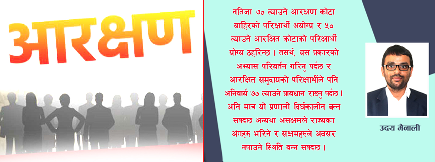 समावेशी सहभागिताको सिद्धान्त र सकारात्मक विभेदको सिद्धान्त अनुरुप आरक्षण प्रणाली लागू गरिएको हो । त्यसको लागि राज्यले ४५ प्रतिशत क्षेत्र र पदमा आरक्षणको व्यवस्था गरिसकेको पनि छ । जसमध्ये महिला ३३ प्रतिशत, आदिवासी जनजाति २७ प्रतिशत, मधेशी २२ प्रतिशत, दलित ९ प्रतिशत, अपाङ्ग ५ प्रतिशत तथा पिछडिएको क्षेत्र ४ प्रतिशत तोकिएको छ । यसको कयौँ गुणहरु हुँदाहुँदै पनि आरक्षणको मुद्दाले बेलाबखत पाएको राजनीतिकरण नै यसको अभिषाप बनेको यथार्थ छ । शक्ति र सत्ता बाहिर हुँदा राजनीतिक दललाई यही मुद्दाको सञ्जिवनी बुटी बन्यो भने सत्तामा आसिन हुनासाथ दिर्घरोग बन्यो । तर, यतिले मात्र आरक्षण बद्नाम भने पक्कै पनि भएको होइन । यसमा राज्यको नीति–निर्माण तहमा पुगेका विद्वानहरुले यसको सही मानेमा सदुपयोग गर्ने तथा लक्षित वर्गको पहिचान गर्ने कार्यमा चुकेको कारण पनि आरक्षणको नेपाली भर्सन विवादास्पद बनेको हो ।