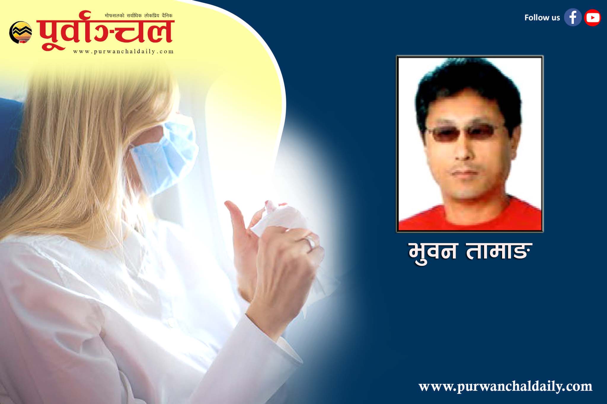 काठमाडौंबाट झापा फर्कनका लागि जब त्रिभुवन अन्तर्राष्ट्रिय विमान स्थल आन्तरिक टर्मिनलको बोर्डिङ पास लिने हल (काउन्टरमा)मा पुगियो त्यहाँको दृष्य देखेर छक्कै परियो । ‘आम्मम के साह्रो भिड हौ ।’ मुखबाट अनायास यस्तै आवाज निस्कियो । भौतिक दूरी कायम राख्न सकिने सम्भावना नै रहेन । स्यानिटाइजर पनि थिएनन् । कोडिभ–१९ फाराम भर्नेको ठेलमठेल उस्तै । हावा खेल्ने त कुरै भएन । जब सुरक्षा जाँचपछि प्रस्थान कक्षमा पुगियो, तब अवाक भइयो । त्यहाँ त खुट्टा टेक्ने ठाउँ थिएन यात्रुहरुका भिडले । हलमा उभिने यात्रुहरु पनि खचाखच थिए । ‘यो सिट खाली राखौँ’ लेखिएका सिटमा समेत यात्रुहरु बसेका थिए । हवाईयात्रुहरु आआफ्नै धुनमा मगनमस्त ।
