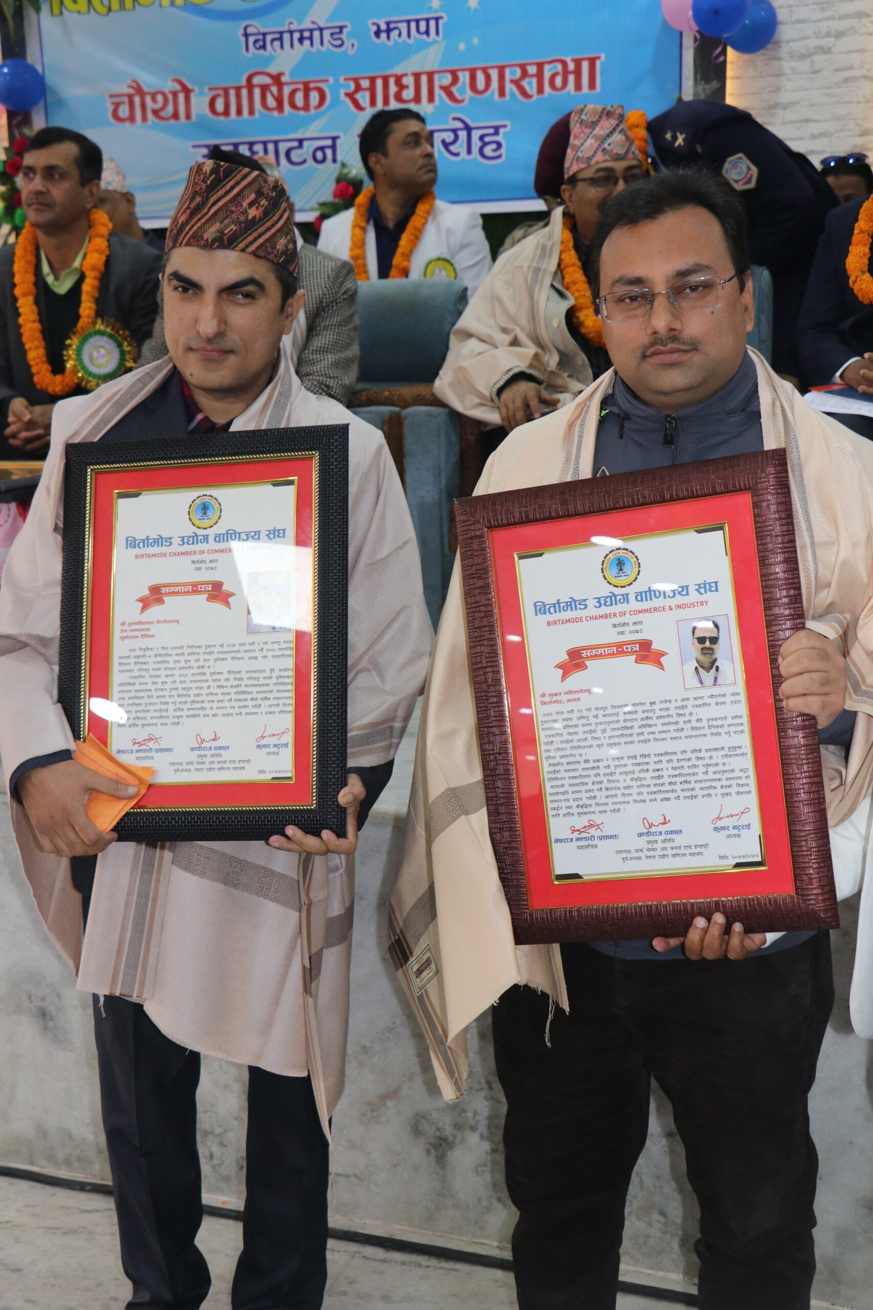 त्यस्तै कार्यक्रममा नेपाल उद्योग वाणिज्य महासंघको केन्द्रीय सदस्यमा निर्बाचित उमेश डालमिया ,नरेन्द्र खड्का , नेपाल उद्योग वाणिज्य महासंघको प्रदेश नं.१ को अध्यक्षमा निर्वाचित टीकाराज ढकाल , सदस्यमा निर्वाचित भुपालराज कटुवाललाई सम्मान गरिएको थियो । उनीहरुलाई दोसल्ला र सम्मान पत्र प्रदान गरिएको बिर्तामोड उद्योग वाणिज्य संघका सदस्य सञ्जीव घिमिरेले जानकारी दिए ।