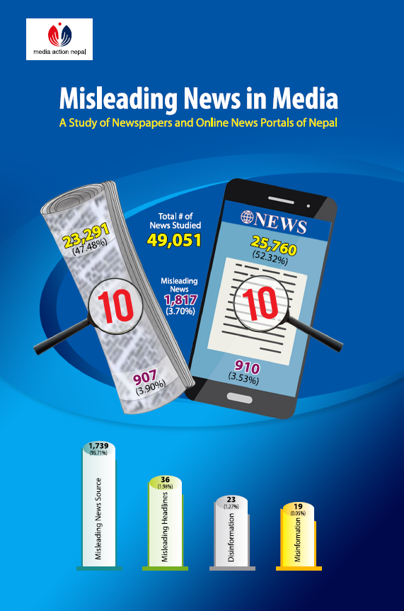 राष्ट्रिय स्तरका अखबार र अनलाइनमा झन्डै ४ % भ्रामक समाचार प्रकाशन गर्ने गरेको तथ्य सार्वजनिक भएको छ । मिडिया एक्सन नेपालले राष्ट्रिय स्तरका १० वटा पत्रिका तथा १० वटा अनलाइन पोर्टलका ५० हजार समाचारको अध्ययन गर्दा ४ % समाचार भ्रामक तथा मिथ्या पाइएको हो ।