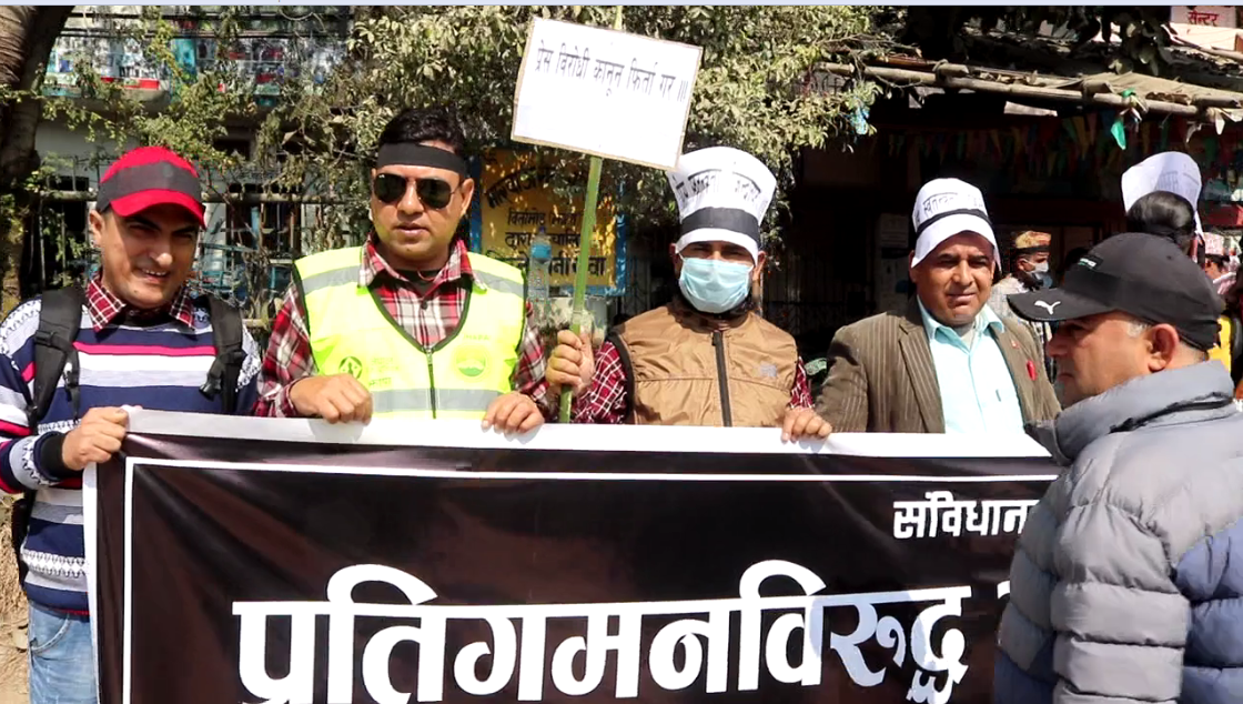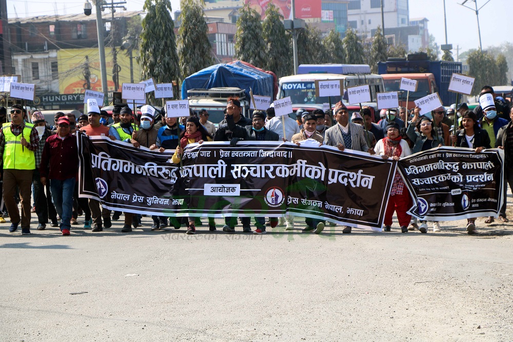 बिर्तामोडस्थित मुक्ति चोकमा भेला भएका झापाली पत्रकारहरुले विरोधि कानुन फिर्ता गर, संबिधानको रक्षा गर, प्रतिगमन मुर्दावादल गायतका नारा लगाउँदै प्रर्दशन गरेका पत्रकारले प्रधानमन्त्री ओलीको संविधान विरोधी कामले प्रतिगमन निम्तिएको भन्दै सच्याउनु पर्ने बताए ।
