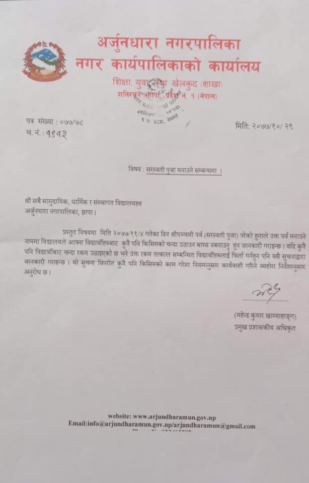 झापाको अर्जुनधारा नगरपालिकाले सरस्वतीको पूजाको नाममा विद्यार्थीबाट चन्दा उठाउने विद्यालयलाई कारबाही गर्ने चेतावनी दिएको छ ।