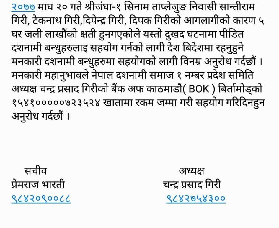 आगलागिमा घरसहित लाखौंको धन नष्ट भएका दशनामीहरुको सहयोगका लागि नेपाल दशनामी समाज प्रदेश १ समितिले सवै बन्धुहरुमा आग्रह गरेको छ ।