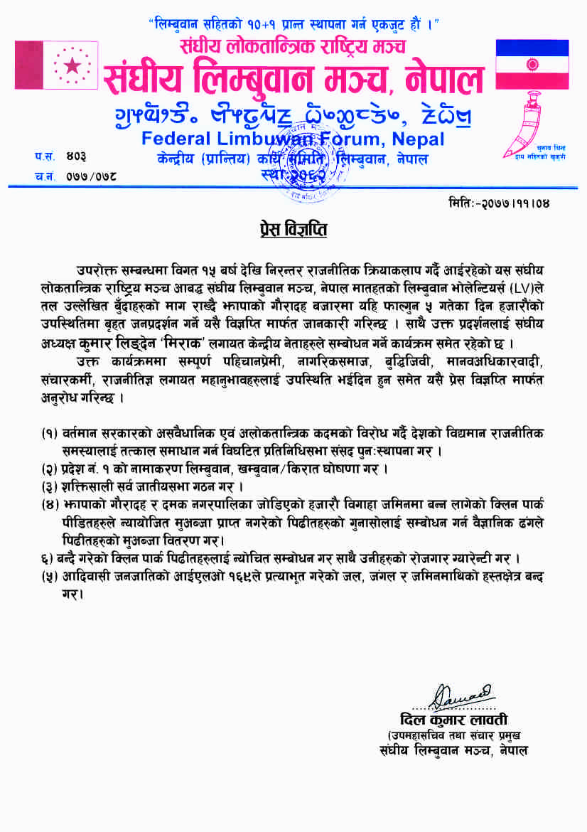 संघीय लिम्बुवान मञ्च नेपालका उपमहासचिव तथा सञ्चार प्रमुख दिलकुमार लावतीद्वारा हस्ताक्षरित विज्ञप्तिमा पीडितहरुलाई न्यायोचित सम्बोधन गर्दै रोजगारीको ग्यारेन्टी गर्नुपर्ने माग गरिएको छ ।