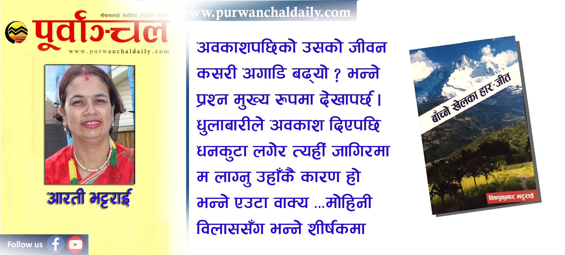 विष्णुकुमार भट्टराईले आफ्नो फेसबुक पेजमा आफ्ना नयाँ दुई पुस्तकका कभर पृष्ठ राख्नु भएदेखि नै पुस्तकहरु कहिले पढ्न पाइएला भन्ने लागिरहेको थियो । त्यही बेला २०७७ साल फागुन ८ गते जयन्द्रप्रसाद प्रसाई साहित्य सेवा कोष बिर्तामोडले आयोजना गरेको कार्यक्रममा ती पुस्तक विमोचन भए । आफू उपस्थित हुन नसके पनि कार्यक्रम सम्बन्धी समाचार अनि कार्यक्रका तस्वीरहरु भने बारम्बार हेरिरहेँ । धन्य छ विज्ञानको विकास जसले गर्दा हामीलाई यो सौभाग्य प्राप्त भएको छ । जसको माध्यमबाट भौगोलिक दूरी भए पनि संसारको जुनसुकै कुनामा भएका सबै विषयका जानकारीहरु घरमा बसी–बसी लिन सकिन्छ । यही सुविधाको सदुपयोग गर्दै पुस्तक विमोचन भएको एक हप्ता पछाडि इ–मेल मार्फत नै मैले विष्णुकुमार भट्टराईका दुई नयाँ पुस्तकहरु पाएँ । पुस्तक प्राप्त हुने बित्तिकै दुईवटै पुस्तकलाई सरसर्ती पढेँ । दुई पुस्तकमध्ये ‘बाँच्ने खेलका हारजीत’ नामक पुस्तकका बारेमा मेरो मनमा लागेका वा भनौं मैले पुस्तक पढिसकेपछि मनन् गरेका कुराहरुलाई सार्वजनिक गर्ने काशिस गरेकी हुँ ।
