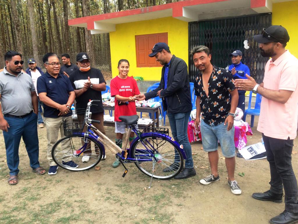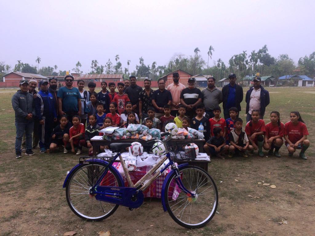 स्थानीय वडा खेलकुद विकास समिति र खेलप्रेमी कर्मासिंह गोम्देनको समन्वयमा प्रदान गरिएको सामग्रीहरुमा २० थान बुट, १४ थान जर्सी र एक थान ग्लोब्स रहेको समितिका संयोजक सुरेन राईले जानकारी दिए । त्यसैगरी विपन्न एवम् नियमित अभ्यासका लागि टाढाबाट आउने खेलाडी सञ्चिता कार्कीलाई दाताहरुबाट एक थान साइकल प्रदान गरिएको थियो ।