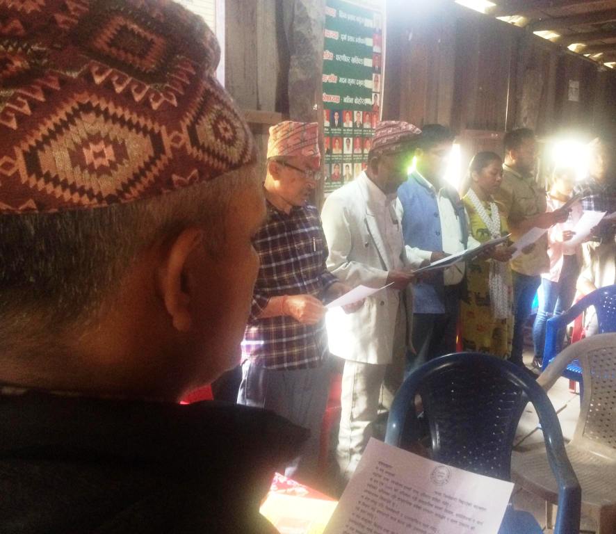 निर्वाचन समितिका संयोजक वेदप्रकाश भण्डारीको अध्यक्षता र वडाध्यक्ष जीवकुमार भण्डारीको प्रमुख आतिथ्यमा आयोजित कार्यक्रममा कार्यसमितिका पदाधिकारी तथा सदस्यहरुलाई संयोजक भण्डारीले पद तथा गोपनियताको सपथ ग्रहण गराएका थिए ।