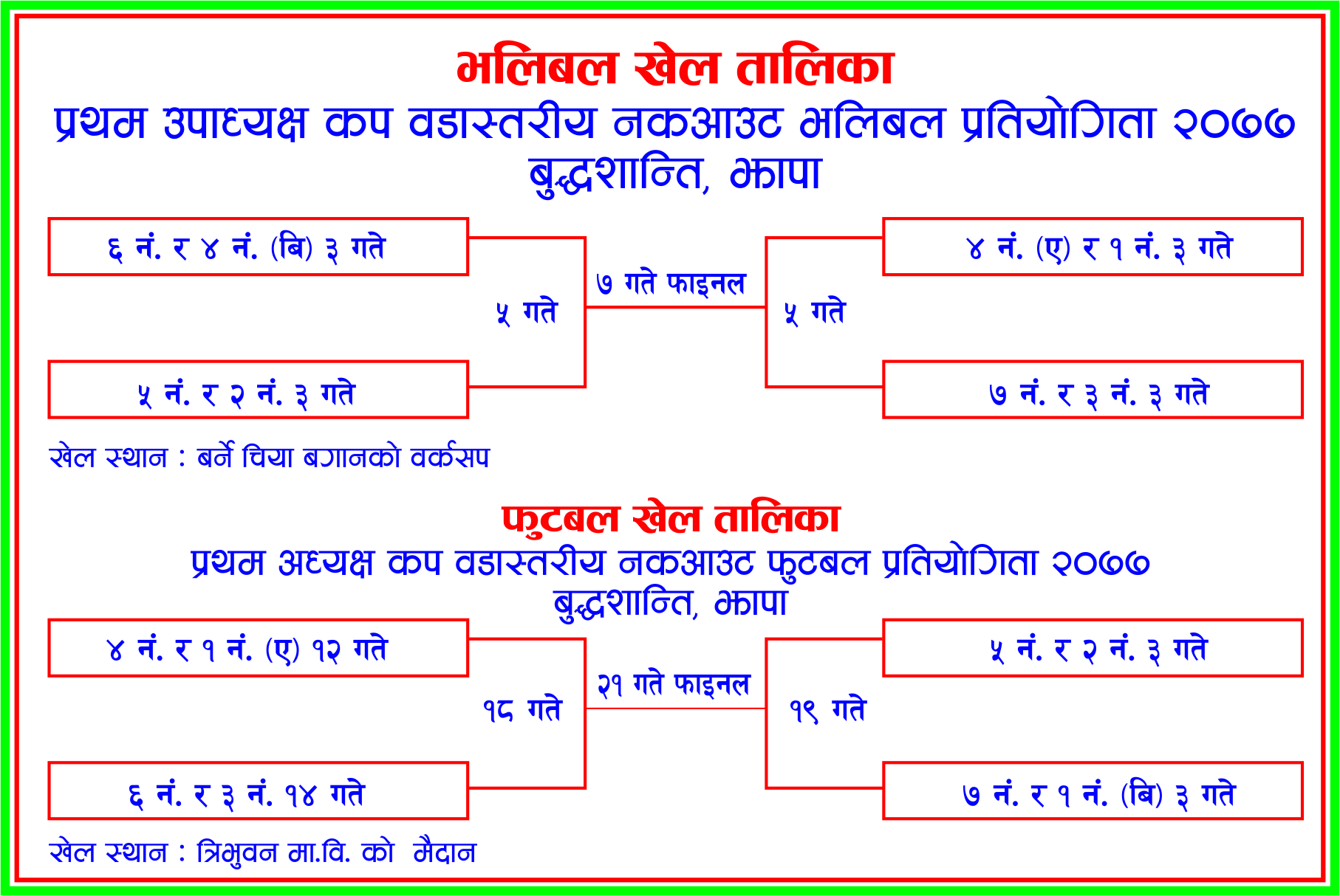 झापाको बुद्धशान्ति गाउँपालिकामा वडा स्तरीय फुटबल र भलिवल प्रतियोगिताको तयारी गरिएको छ । आगामी चैत ३ गतेबाट प्रथम उपाध्यक्ष कप वडास्तरीय नकआउट भलिवल प्रतियोगिता हुदैंछ ।