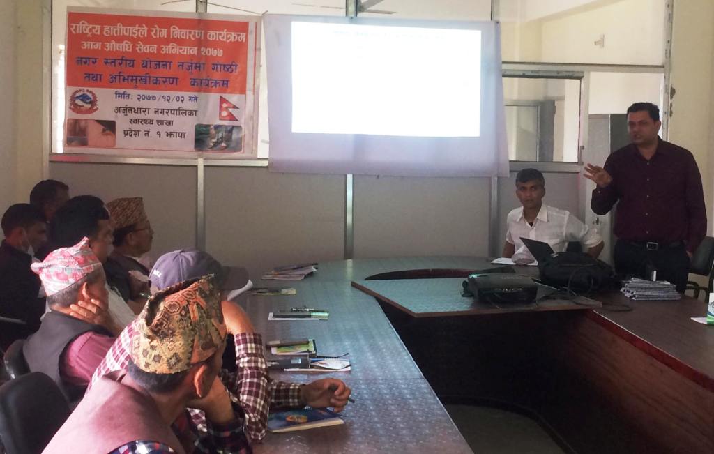 हात्तीपाइले रोग निवारणका लागि आम औषधी सेवन कार्यलाई प्रभावकारी बनाउने उद्धेश्यले नगर स्वास्थ्य शाखाको आयोजनामा नगरस्तरिय योजना तर्जुमा गोष्ठी तथा अभिमुखिकरण कार्यक्रम सोमबार सम्पन्न भएको छ ।