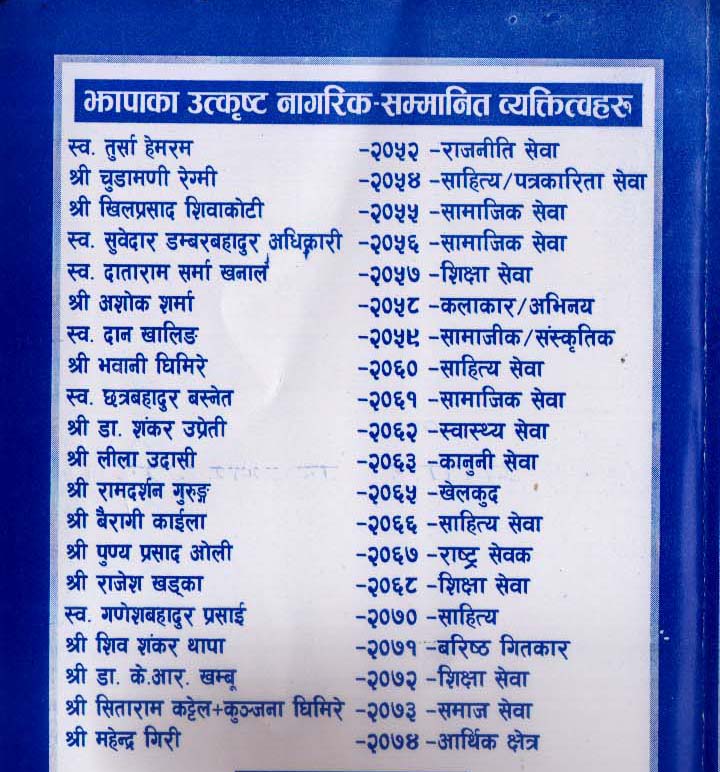 हरेक बर्ष विविध विधामा झापालीमध्ये एक जनालाई उत्कृष्ट नागरिक घोषित गरिँदै आएको र यस वर्ष उत्कृष्ट नागरिकको रुपमा पत्रकारिता ÷ सञ्चार विधामा चयन भएका उत्कृष्ट नागरिकलाई स्वर्ण पदक, सम्मानपत्र, नगद प्रदान गर्नुका सार्थै झाँकीसहित नगर परिक्रमा गरेर निवाससम्म पु¥याइने उत्कृष्ट नागरिक सम्मान समारोह –२०७७ का संयोजक यामकुमार खड्काले बताए ।