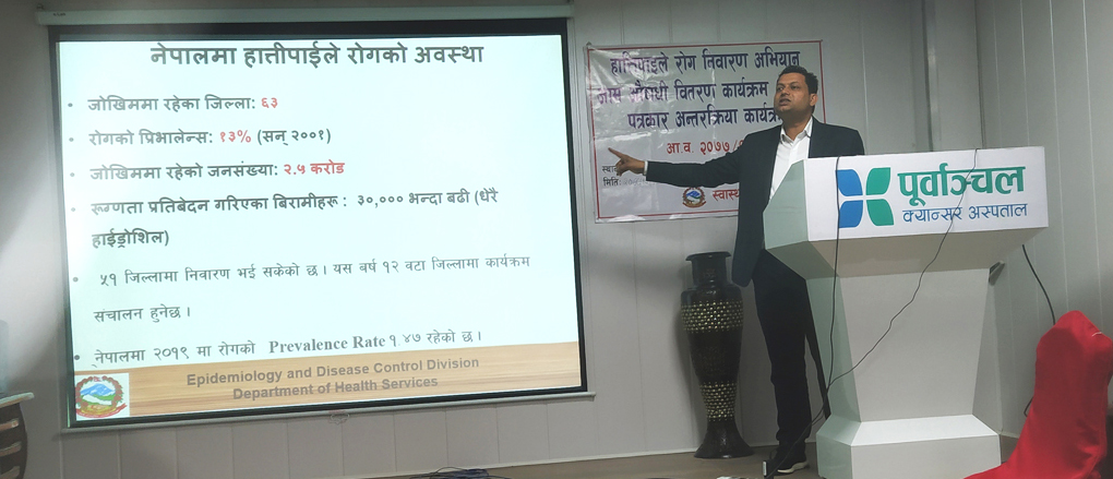 कार्यक्रमको उद्देश्य तथा औचित्यमाथि स्वास्थ्य कार्यालय झापाका कार्यालय प्रमुख ईश्वरीप्रसाद पौडेलले प्रकाश पारेका थिए । उनले १०आंै चरणको हात्तीपाइले औषधि वितरण अभियान भएको बताउँदै नेपाल सरकारले सन् २०२६ सम्ममा निवारण गर्ने उद्देश्य राखेको बताए । क्यान्सरभन्दा घातक रोग हात्तीपाइले भएकाले सवैले औषधि खानु पर्नेमा उनले जोड दिए । हात्तीपाइलेले अशक्त, असमर्थ तथा अपाङ्गता बनाउने, रोग लागेको व्यक्ति सामाजिक तिरस्कारमा पर्ने भएकाले पनि औषधि सेवन गर्नुपर्ने उनले बताए ।