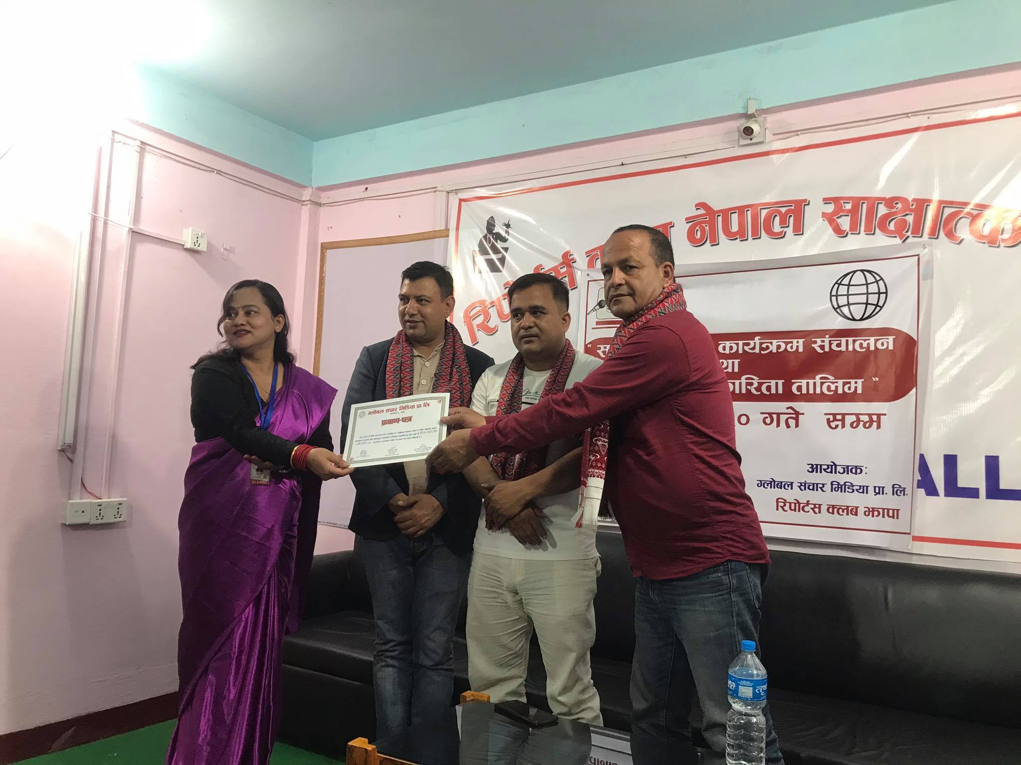 ग्लोबल संचार मिडिया प्रा।लि र रिपोर्टर्स क्लब झापाको आयोजनामा समाचार बाचन कार्यक्रम संचालन तथा आधारभूत पत्रकारिता सम्बन्धी चार दिवसिय प्रशिक्षण कार्यक्रम सम्पन्न भएको छ ।