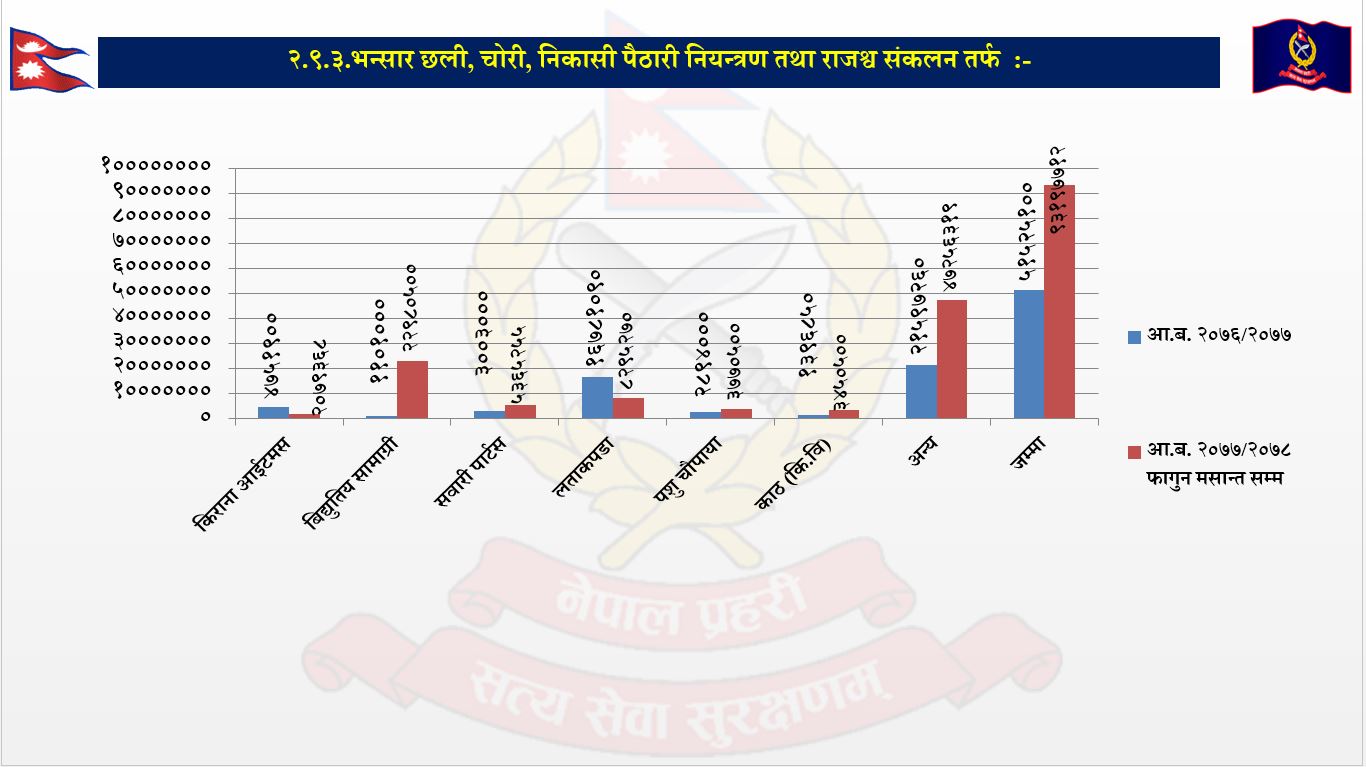 त्यस्तै विद्युतीय सामग्रीबाट दुई करोड २९ लाख ८० हजार पाँच सय, सवारी पाट्र्सबाट ५३ लाख ६५ हजार दुई सय ५५, लत्ताकपडाबाट ८२ लाख ९५ हजार दुई सय ७०, पशुचौपायबाट ३७ लाख ७० हजार पाँच सय, काठबाट ३४ लाख ५० हजार पाँच सय र अन्य विभिन्न सामग्रीबाट चार करोड ७५ लाख ५६ हजार तीन सय १९ गरी नौ करोड ३१ लाख ९७ हजार सात सय १२ रुपैयाँ राजश्व संकलन गरेको हो ।